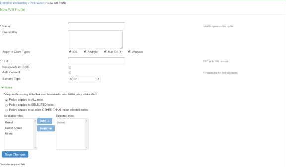 Wi-Fi profiles provide Android, iOS, MAC OS X, and Windows devices with secure access to wireless networks. One or more Wi-Fi profiles can be assigned to specific user roles or to all roles. Up to 10 profiles can be defined.