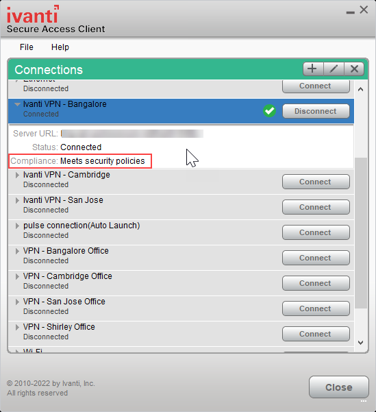1.Launch Ivanti Secure Access Client application and select a connection and click Connect.