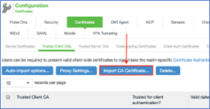 - On ICS console, select System > Configuration > Certificates > Trusted Client CAs to display the configuration page.