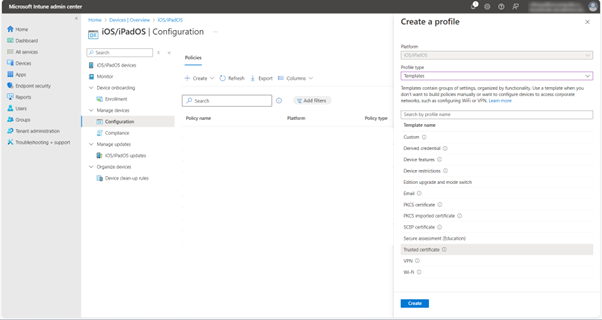 - In the Create a profile window, select Profile type as Templates, select Trusted Certificate and click Create.