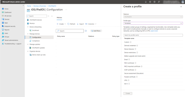 - In the Intune admin console, navigate to Home > Devices > iOS/iPadOS > Configuration.