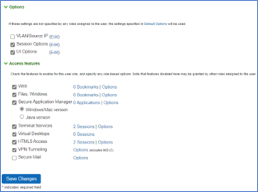 For L4 Per App VPN proxy, in ICS server navigate to Users > User Roles > General. In the Access features section, enable Secure Application Manager (Windows version). For more details, refer to the section “Configuring General Role Options” in Ivanti Connect Secure Administration Guide.