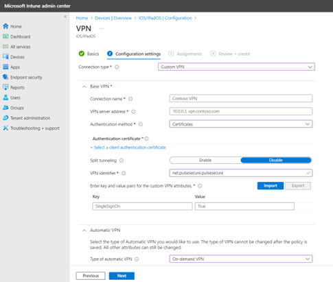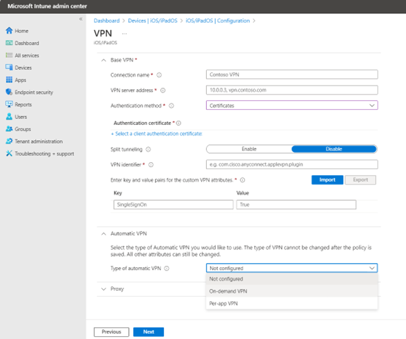 For more information on VPN profile, refer Configure VPN settings to iOS/iPadOS devices in Microsoft Intune.