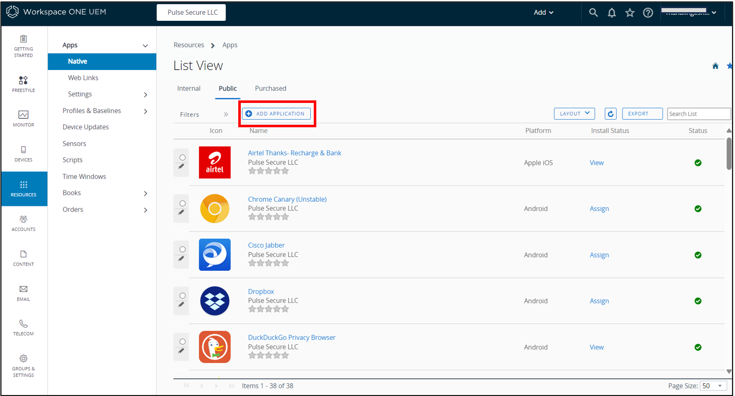 From Workspace ONE, select Resources > Apps > Native > Public > Add Application.