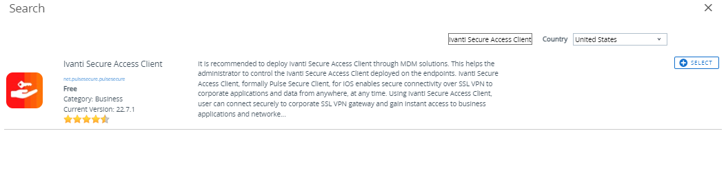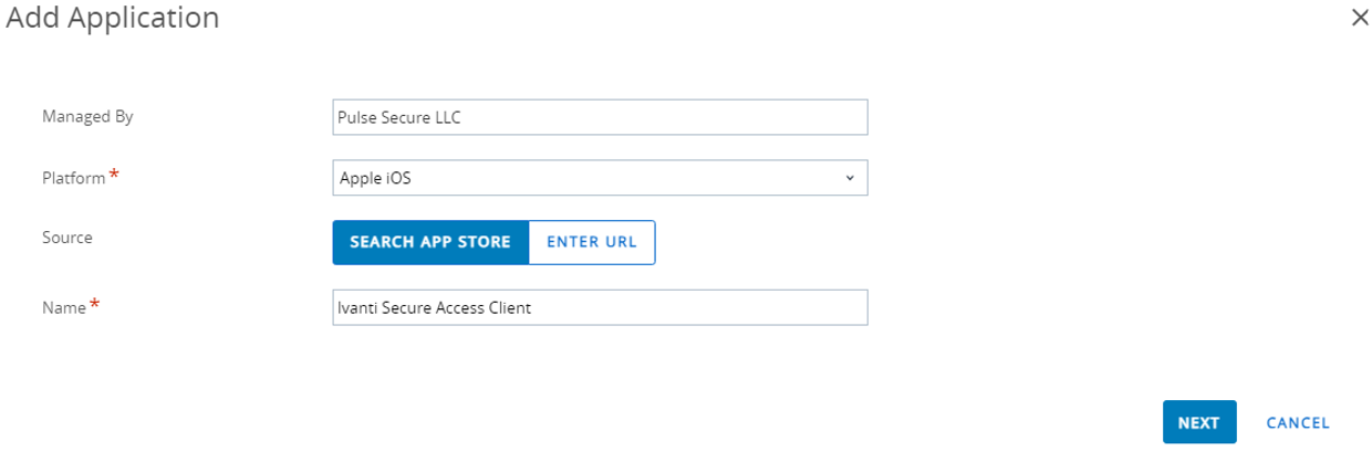 Click Search App Store and specify the name of the application, and then click Next. For example: Ivanti Secure Access Client