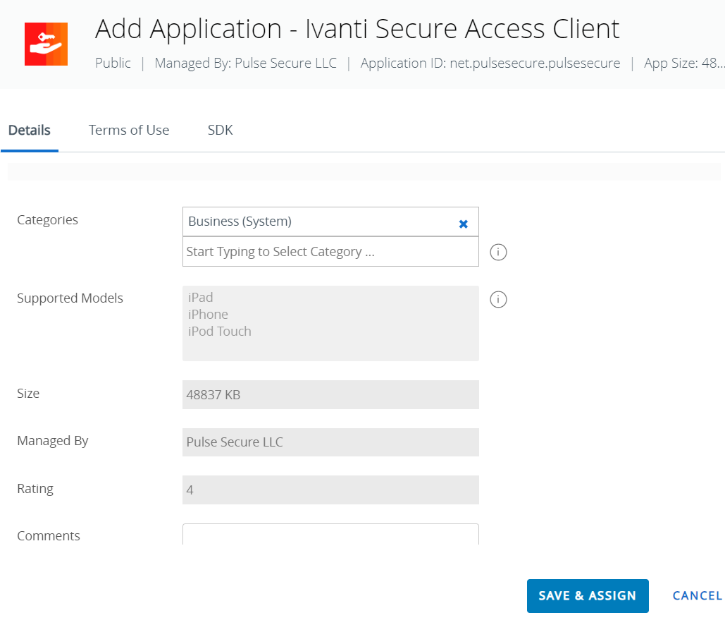 In the Add Application window, enter application details, terms of use and SDK profile details, and then click Save and Assign.