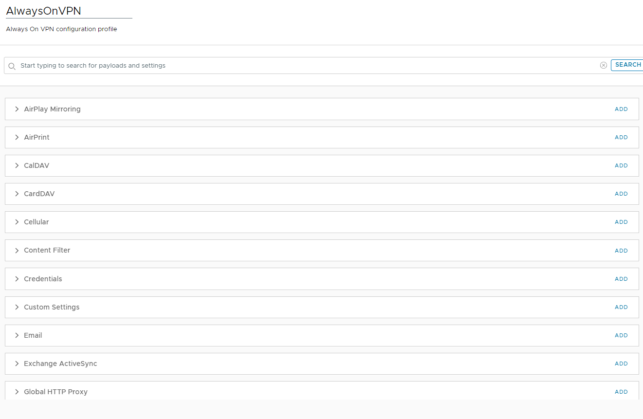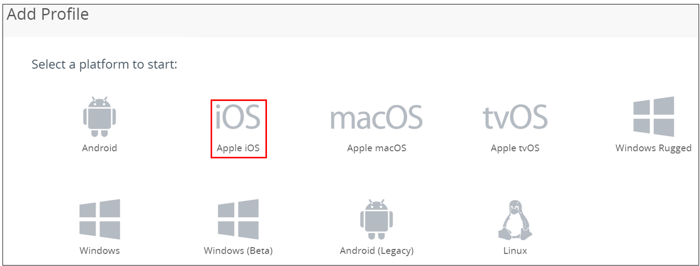 From the Workspace ONE console, select Resources > Profiles & Baselines > Profiles > ADD, and then select Add Profile.
