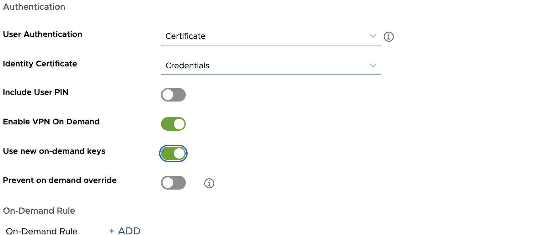 Enable Use new on-demand keys and define the rules for VPN On Demand connection.