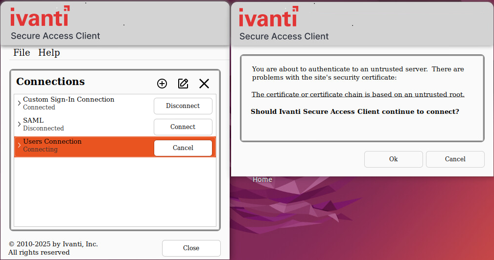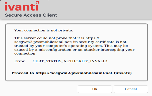 If the user connects to servers which have certificates not trusted by the machine the following error message displays: