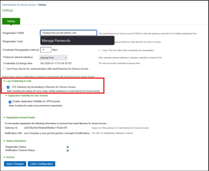1.In ICS Gateway, select System > Ivanti NSA and click Clear Configuration.