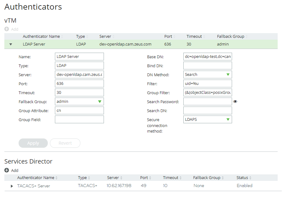 Services Director supports standard LDAP user authentication and certificate-based secure LDAP user authentication for both Services Director and VTMs.