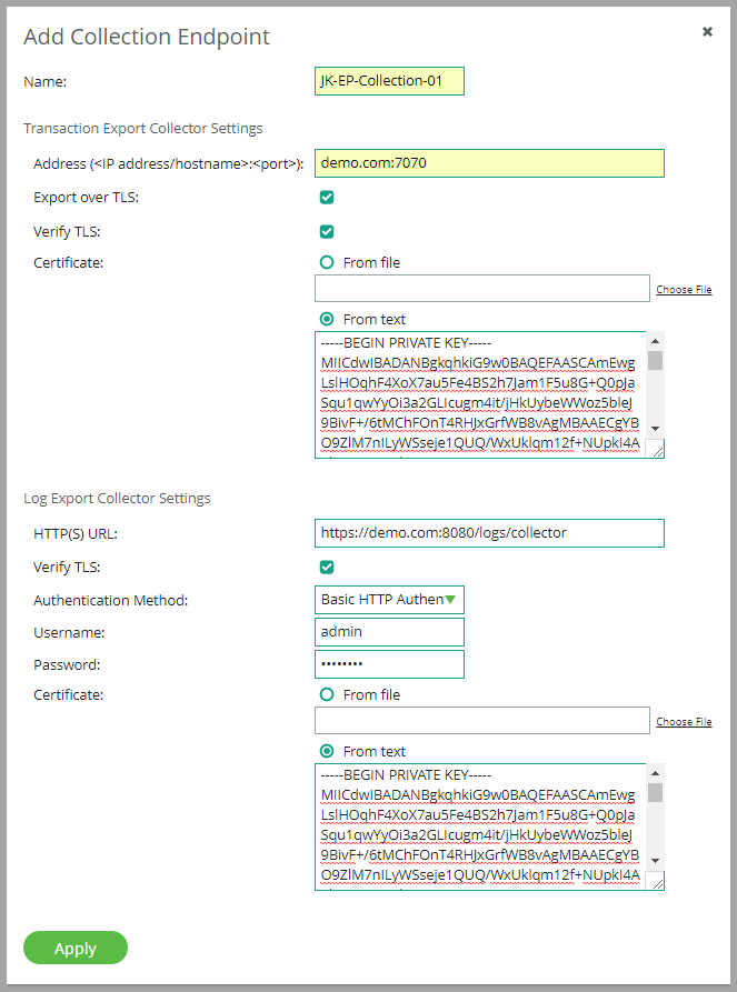 8.Click Apply. The new Log Export Type is added to the Log Export Types table.