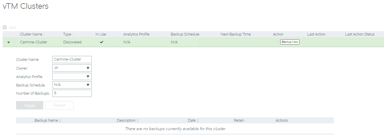 You can then enable analytics on all vTMs in a cluster by applying the required analytics profile to the cluster. You do this from the vTM Clusters page. See Enabling Analytics on a vTM Cluster.