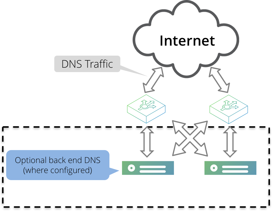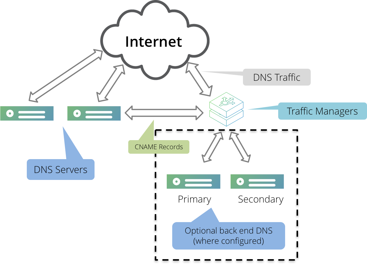 For an Inline deployment, the Traffic Manager operates as the authoritative name server for the entire domain containing the hostname. A DNS request is received on a DNS Virtual Server, and processed by the associated Pool, which might be either the built in DNS server or an external pool of DNS servers.