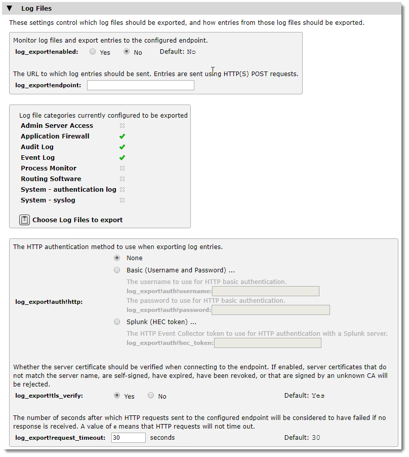 Use the Log Files section to configure how the Traffic Manager exports log data to the defined endpoint.
