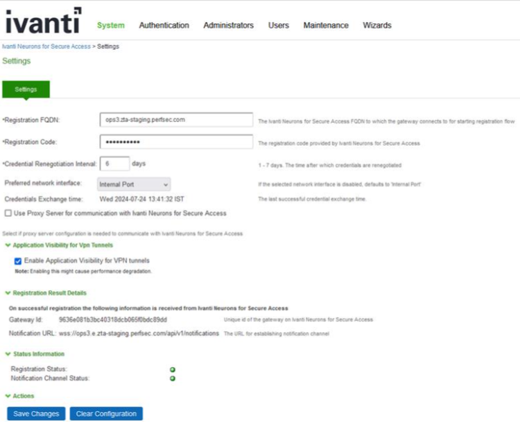 Select the System > Configuration > Ivanti Neurons for Secure Access > Settings tab.