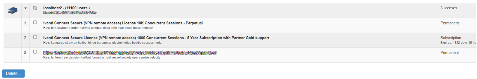 5.To delete one or more licenses, select the corresponding check box(es) and click Delete.