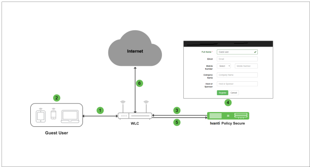 Guest user logins with guest user credentials. Ivanti Policy Secure validates the credentials and accordingly the user can access Internet.