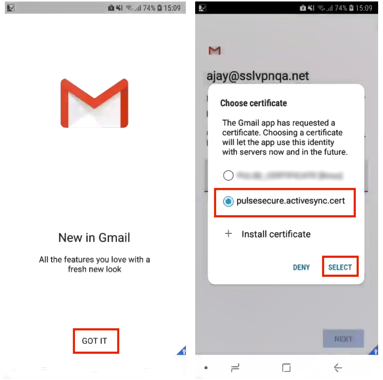 •Pulse Workspace fetches the ActiveSync certificate from a Windows CAWE server and pushes it to Android and iOS onboarded device, see Working with ActiveSync Certificates via Windows CAWE.
