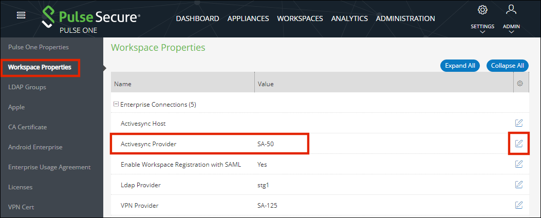 This feature enables a Pulse Connect Secure gateway to function as an ActiveSync proxy for Mobile devices that are onboarded through Pulse Workspace Server. Pulse Connect Secure gateway will be able to filter out and reject ActiveSync connection requests coming from unauthorized mobile devices and allow only those devices that have been successfully provisioned on Pulse Workspace Server.