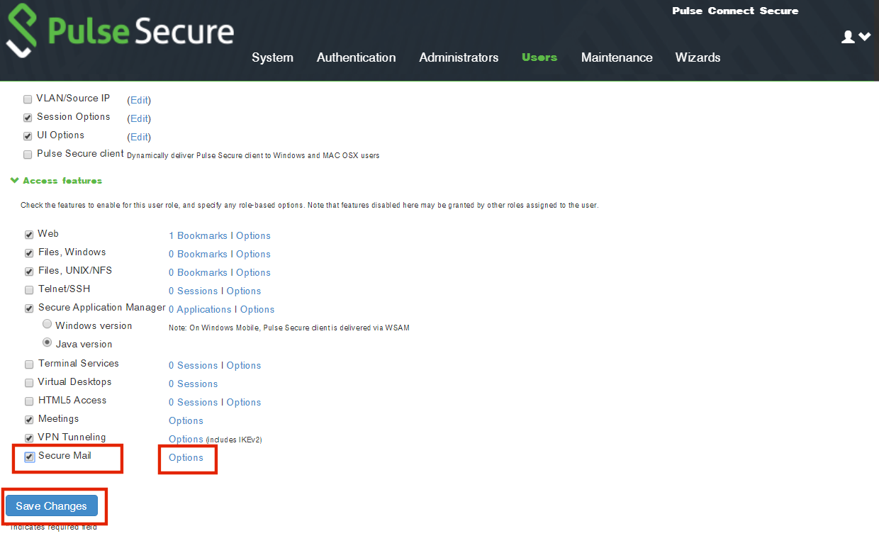 5.Navigate back to the Access features for the secure_email role and click Options.
