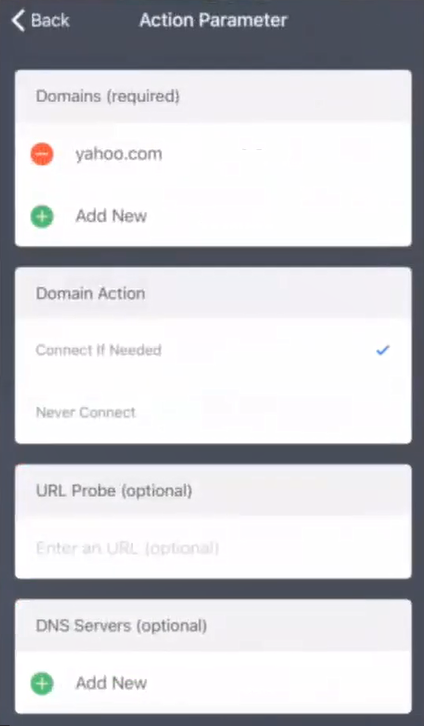•Connect If Needed. Starts the VPN if DNS resolution for the domains fails. For example: