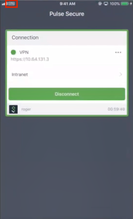 The VPN will active and display the VPN icon at the top of the screen. For example: