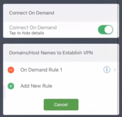 Each VPN on Demand rule has user-defined rules criteria that enable a match to be determined, see Understanding VPN on Demand Rules Criteria.