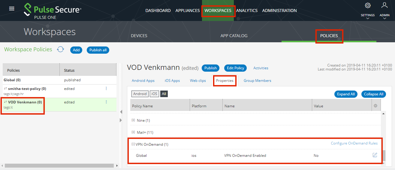 Managed client enrollment for mobile devices does not use Mobile Device Management (MDM). Instead, the admin can currently push policies manually from Pulse Workspace to enable VPN on Demand on a mobile device.
