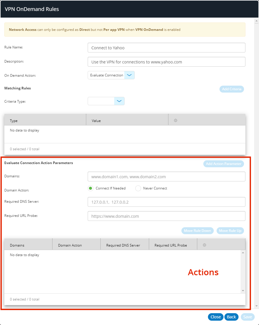 Each VPN on Demand rule that has an On Demand action of Evaluate Connection must have one (or more) action parameters which enable the rule to be evaluated.