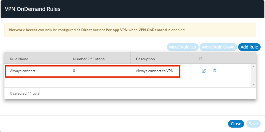 When the policy property VPN OnDemand Enabled is True, Network Access for this policy can only be configured as Direct (and not Per app VPN).