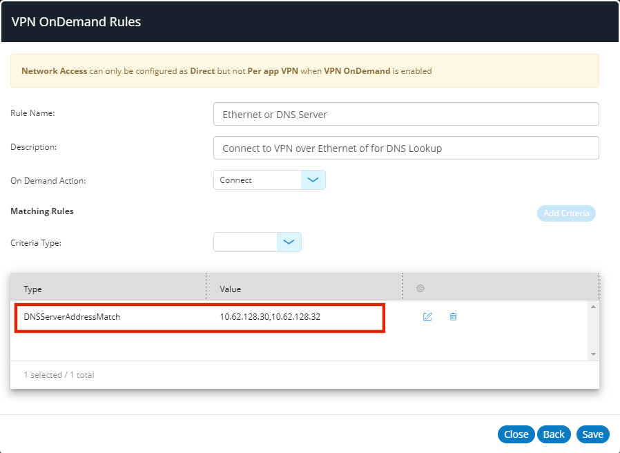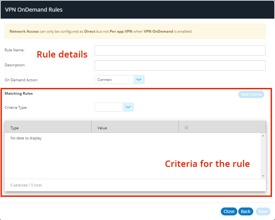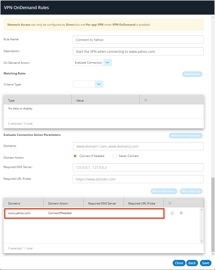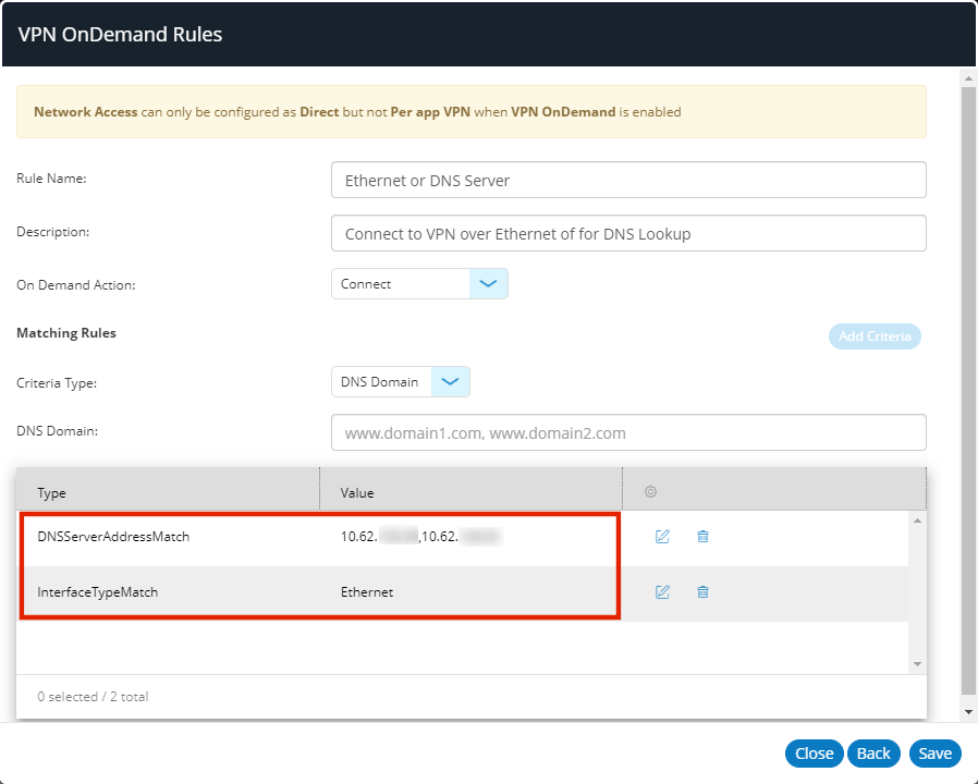 Each VPN on Demand rule can have one or more rules criteria which enables it to be evaluated as a match.