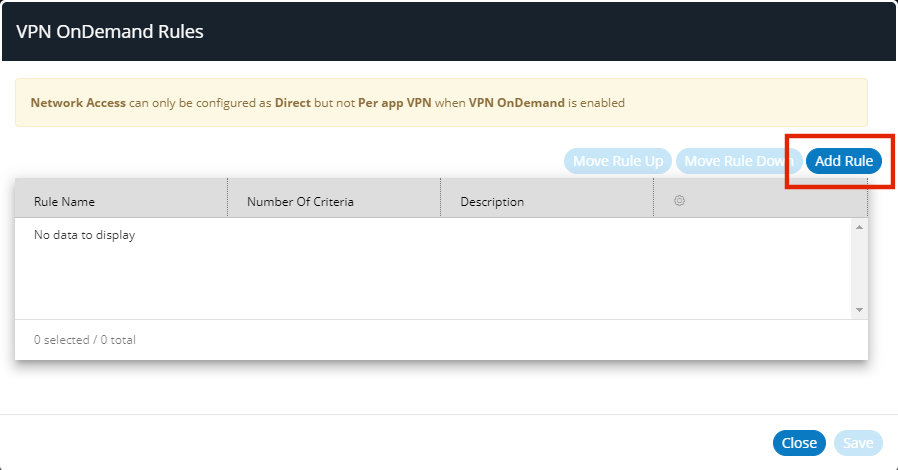 8.(Optional) To create a standalone rule that connects to the VPN for all domains/endpoints, you must define a rule with no specified criteria:
