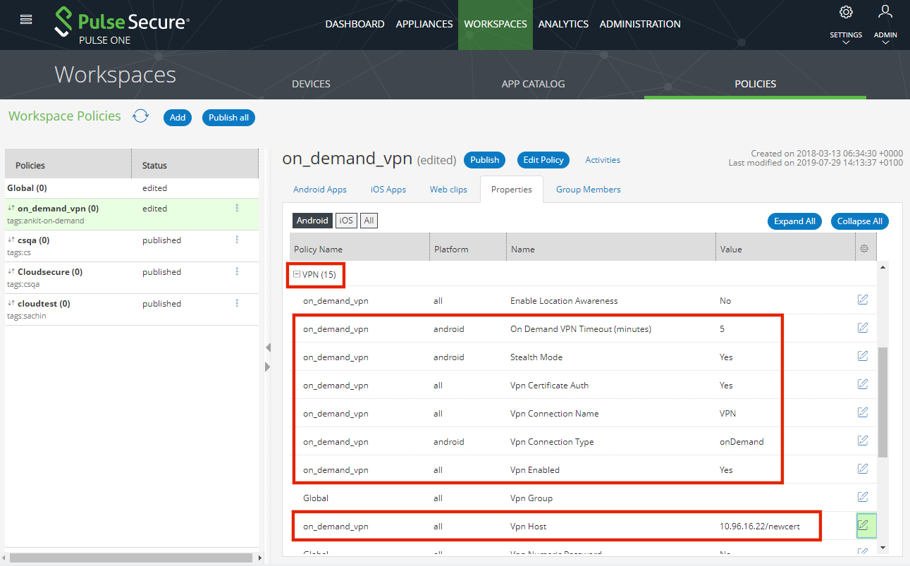 •VPN On Demand – Apps can be configured to automatically connect to VPN when they are launched. This feature is intended to be used only within the Android work profile, since it is predominantly being used at an app level and only Pulse Workspace is aware of the apps in the work profile. Using this feature, only the corporate managed apps will transfer the data over the VPN and the employee's other personal data like personal web browsing, connections to gaming and social networks will not use the VPN.