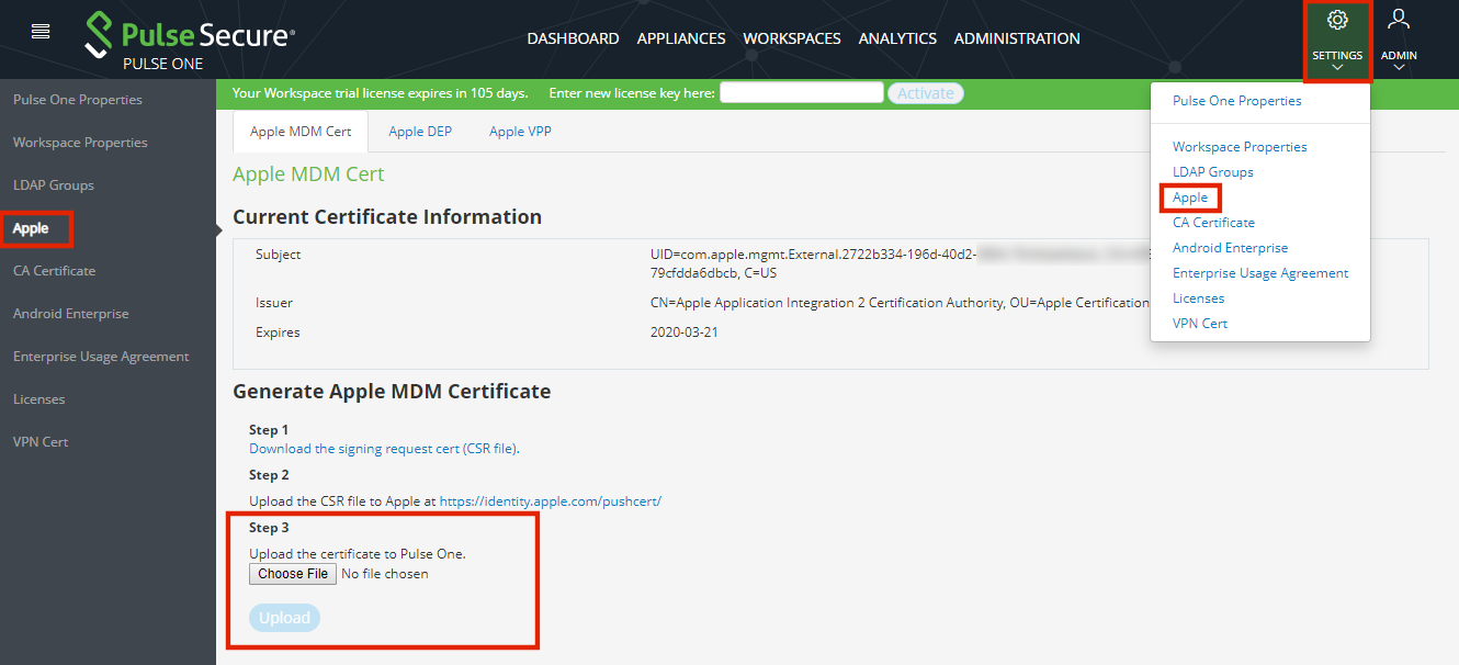 1.Click the settings icon on top-right-corner of the page and select Apple MDM Cert.