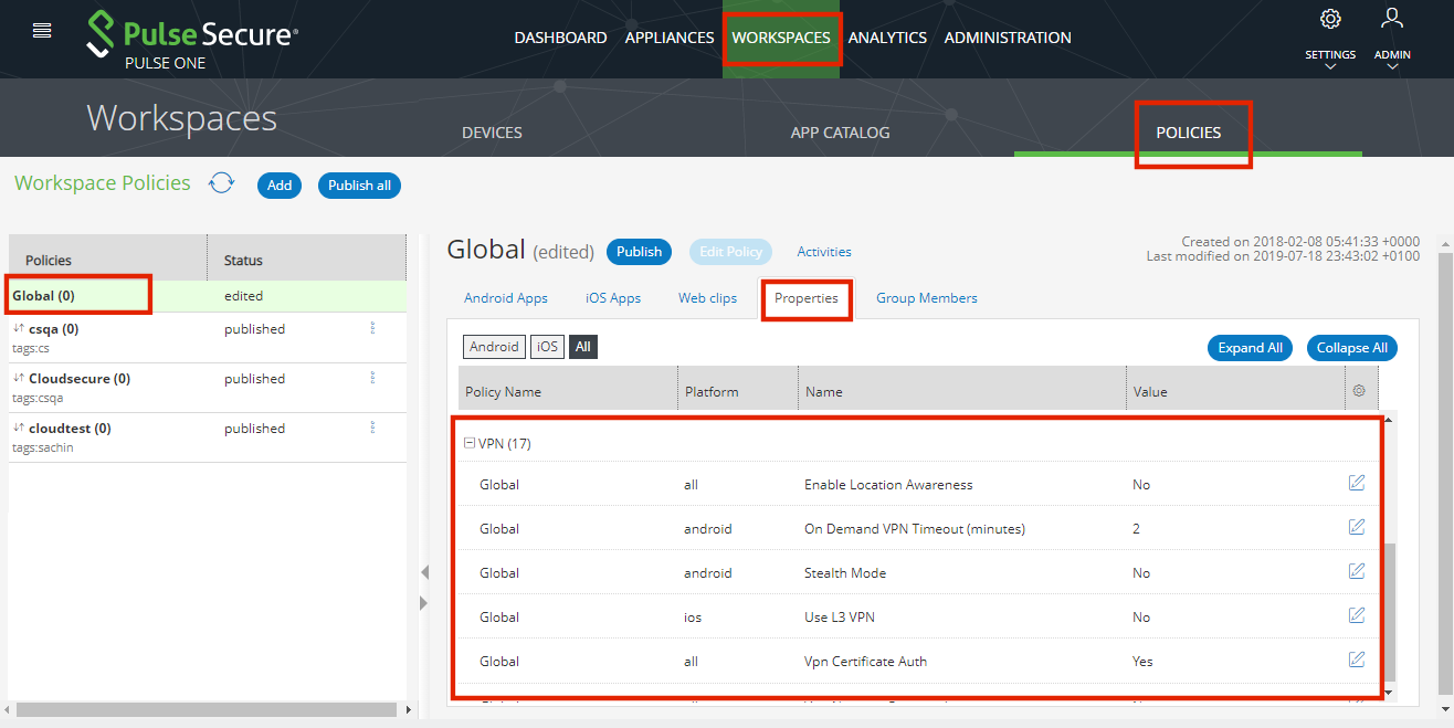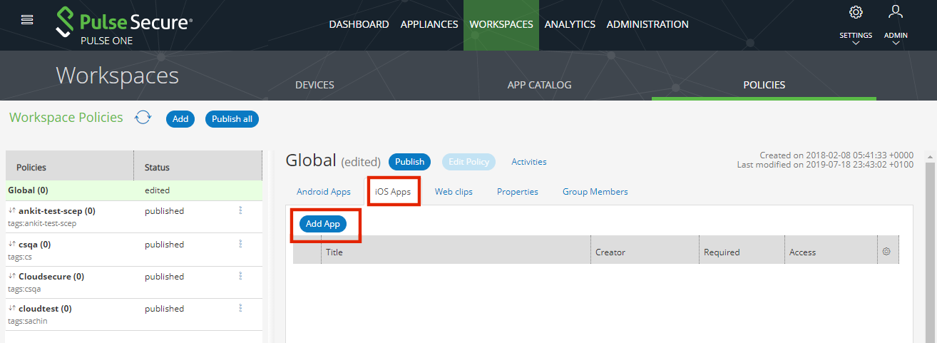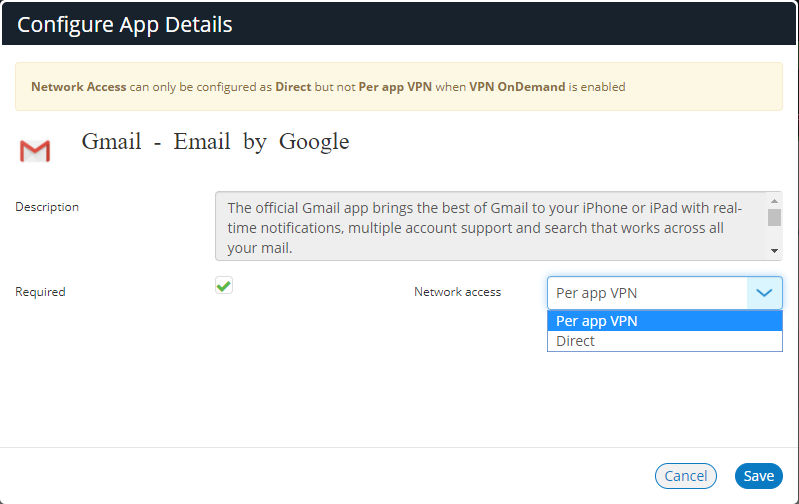 To add the apps from App Catalog to the policy with Network Access as Require VPN and publish, see Adding an Android App to a Policy.