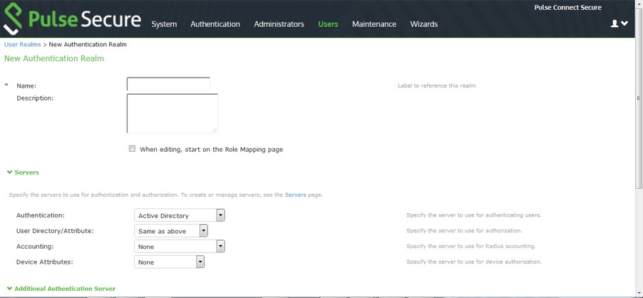 6.Navigate to Users > User Realms, create a new Realm and assign it with one of the supported Authentication Servers.