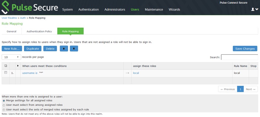 7.Navigate to Users > User Realms > <select user> > Role Mapping, create a Role mapping rule and assign it to the corresponding Role.