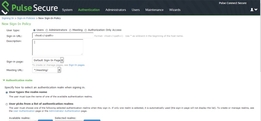 8.Navigate to Authentication > Signing In > Sign In Policies, create a new Sign-In URL and assign it to the corresponding realm.