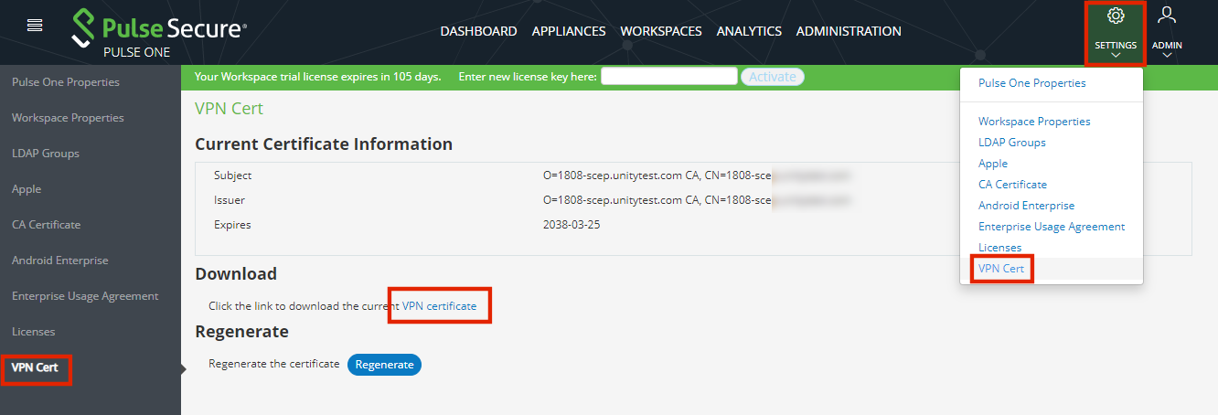 You can use the VPN Cert window to download your Workspace Root CA certificate. This will be used when configuring your VPN.
