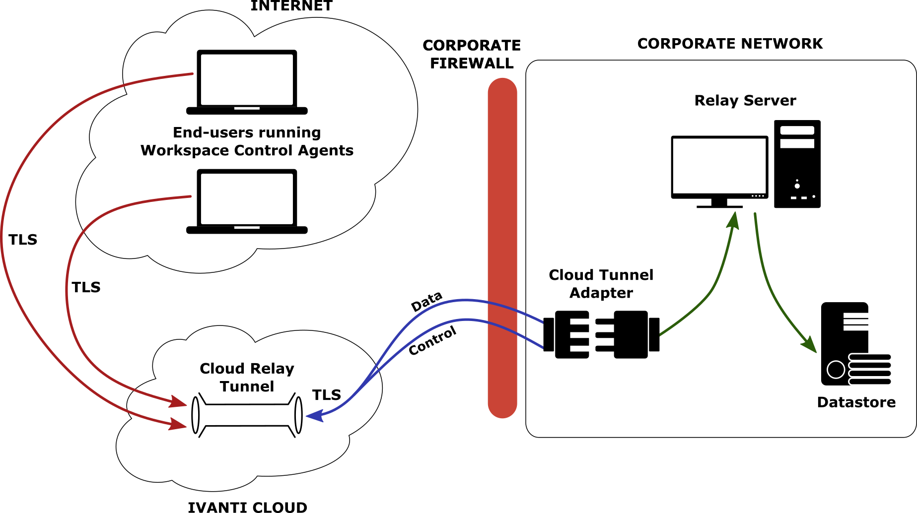 Ivanti Cloud Relay uses only an outbound connection from within the corporate network to the Internet and, thus, alleviates security concerns about inbound ports in the corporate firewall. This enables Workspace Control Agents outside the corporate network to connect to the on-premises Relay Server.