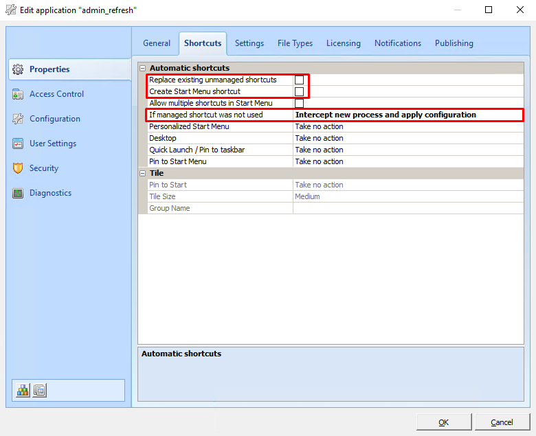 Under Composition > Applications > Start Menu or Application List tabs, ensure that applications have the following settings configured on their Properties > Shortcuts tab > Automatic shortcuts: