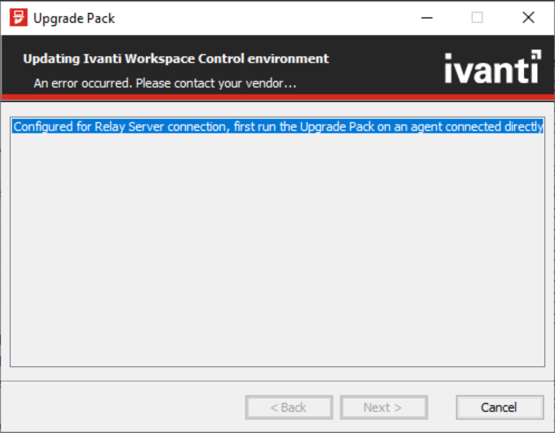 have a direct connection to the Datastore, and not to a Relay Servers. If the attended Workspace Control upgrade is first attempted from a computer connected to a Relay Server, and not directly to the Datastore, it results in the following error: