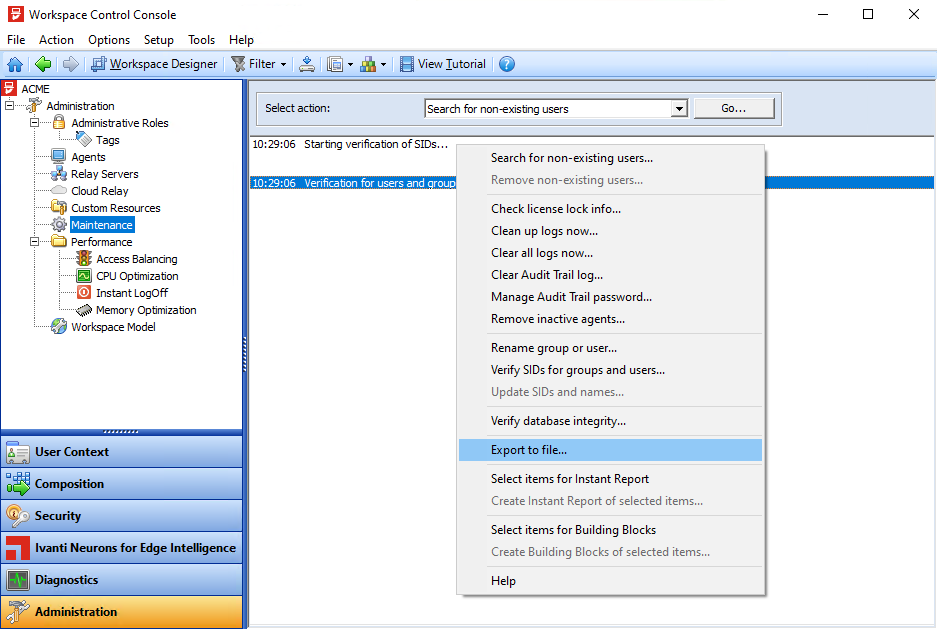 Open the Workspace Control Console and navigate to Administration > Maintenance.