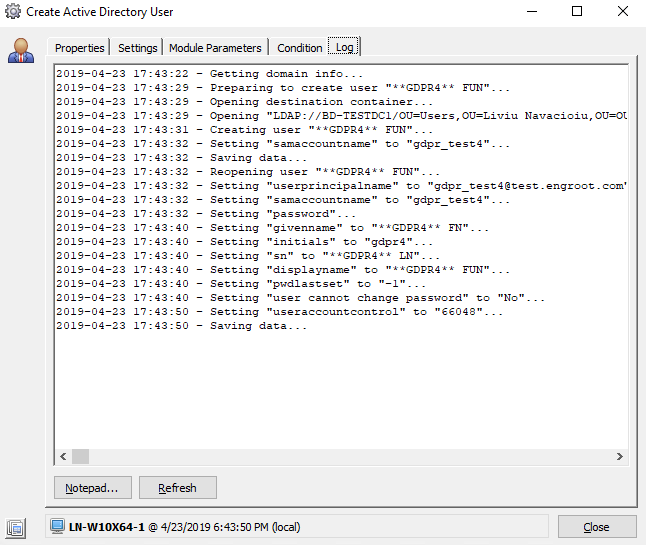 The screen shots on the left show the information for a Run Book that creates and manages an active directory user named "gdpr test4". The screen shots on the right show that same information after a search for "gdpr test4" was done and then replaced with "**GDPR4**".