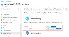 From the left-side navigation menu, go to Settings > TLS/SSL settings and then, from the right-side pane, under Bindings > Protocol Settings, configure the following: