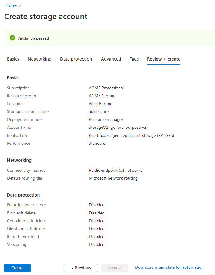Complete the rest of the storage account configuration (Networking, Data protection, Advanced and Tags) according to your business requirements, and then click Review + Create.
