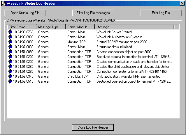 When you open a Wavelink Server log file, the log reader displays the log file information.
