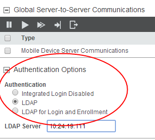• Enable the LDAP for Login and Enrollment option. Provide the address for the servers and account credentials in the text boxes that appear when the option is selected. This allows Console users to log in to the Console using their LDAP credentials, and device users can enroll using LDAP credentials. This option requires LANDesk Mobility Manager 9.5.
