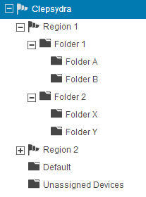 Avalanche 使用文件夹来组织设备、控制台用户和设置。您可以创建文件夹来将位于相同实际位置或需要类似管理的设备分组在一起。在位于控制台左侧的导航树中对文件夹进行组织: